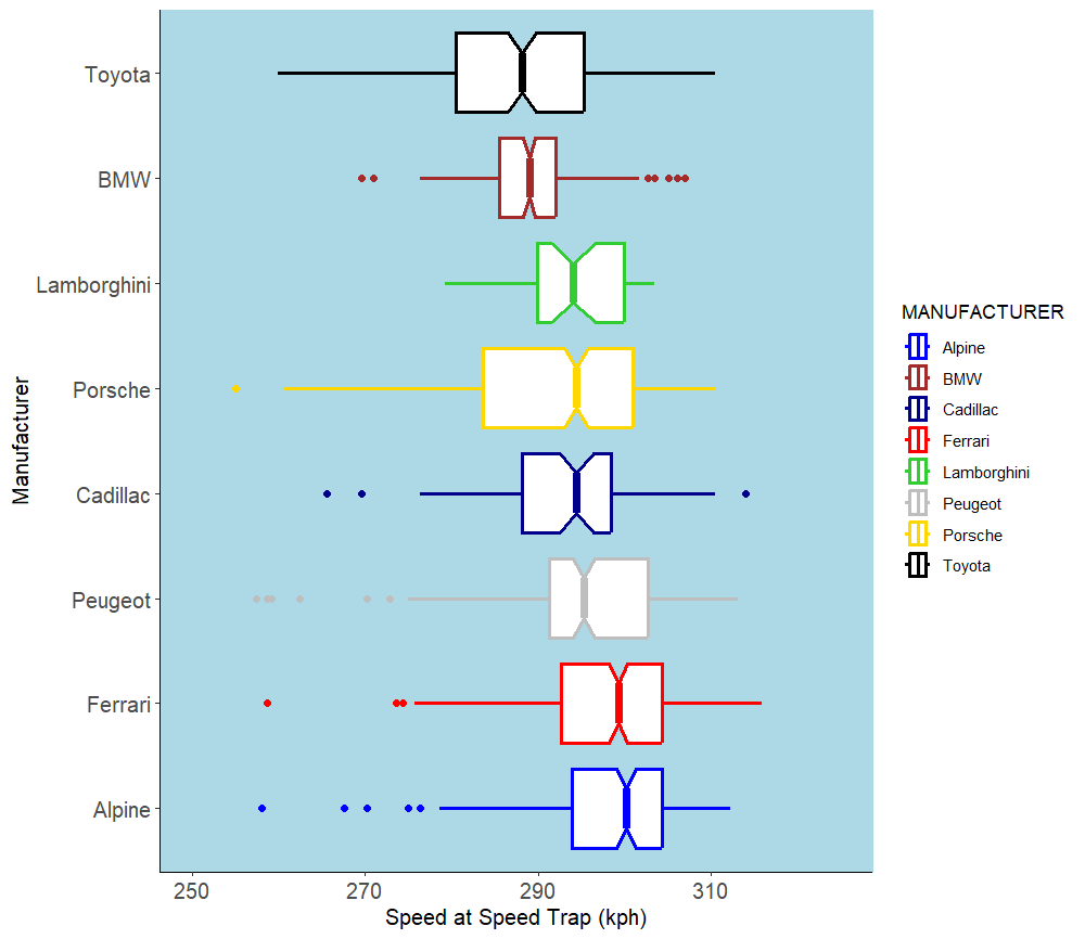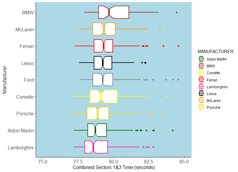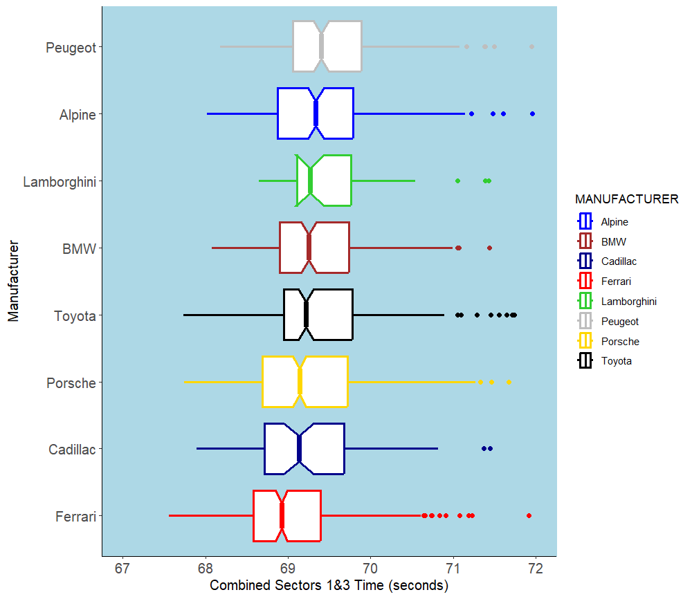 I’ve taken the data from all six hours of the race and combined the sector one and three times, removed any non-green flag laps or laps where the car was in the pits, and put the rest on the box plot below. (This is a “notched” boxplot, which attempts to visualise statistical significance – if the notches don’t overlap then the difference is significant. You’ll see the notches are wider for Cadillac and Lamborghini, which is because the single-car efforts have half as many laps and therefore a wider margin of error.