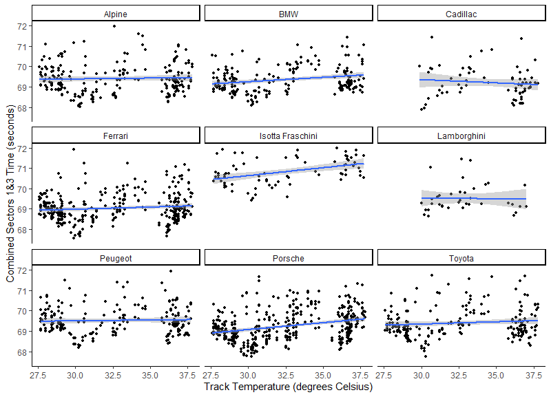 That said, there’s another feature of Le Mans to consider and that’s how the cars cope as the temperature changes as we go from day to night. There wasn’t a huge range of temperature variation at Spa but the track temperature did go from a high of 38°C to a low of 28°C (for comparison, at Le Mans last year it ranged from 22-48°C), so we can perhaps get some idea by looking at how each car’s laptime varied as the temperature changed. Obviously, due to other factors like traffic and tyre strategy, this is going to be really imprecise, but it’s possible we’ll learn some things. The trendlines here are plotted using R’s linear model function, with the grey areas showing the confidence intervals: