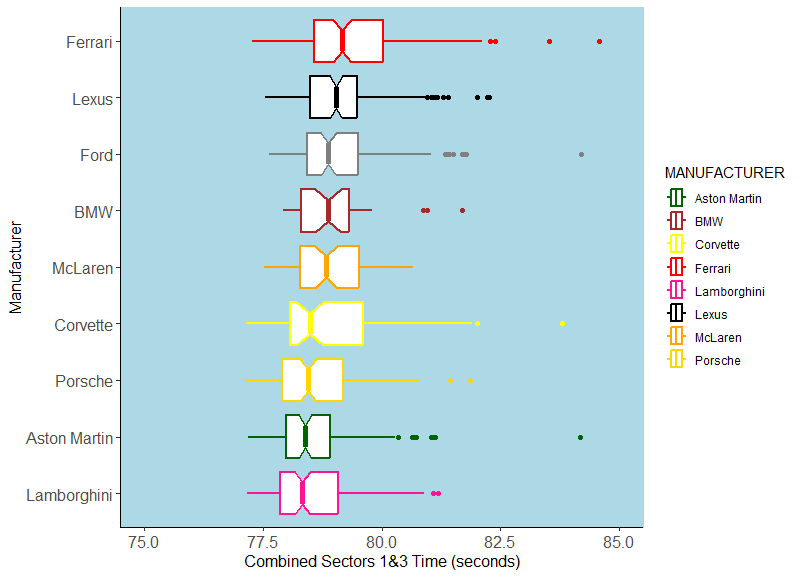 Using the same methods as for the Hypercars above, we get this boxplot of combined sector one and three times: