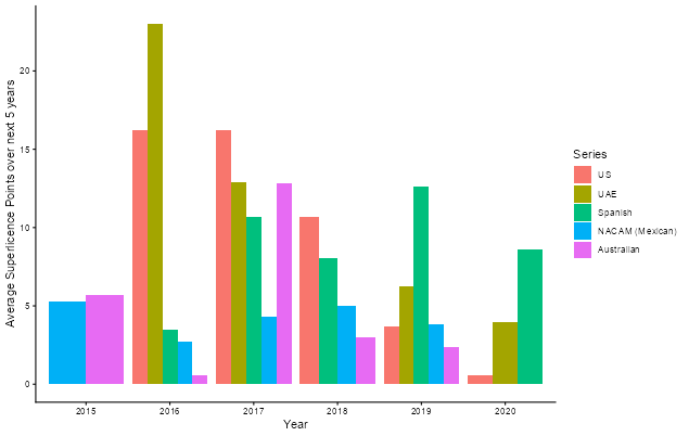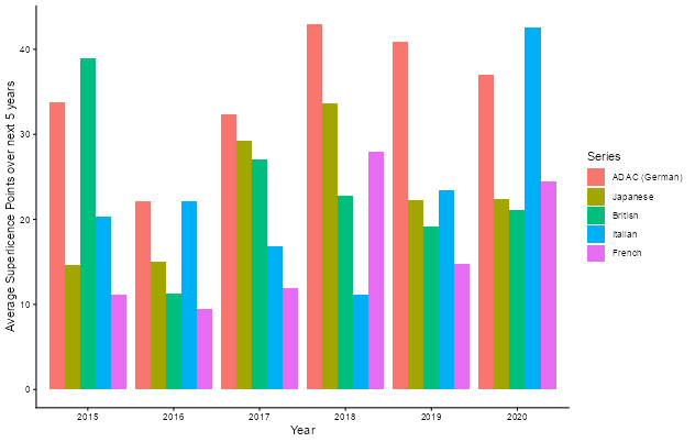 The next question would be how to measure this performance. Since almost everyone who competes in F4 is doing so with an ultimate goal of entering the F1 World Championship, a reasonable answer to this question would be in terms of progress towards that. Fortunately, the FIA has already quantified this for us; to be qualified to race in F1, a driver must accumulate 40 Super Licence points. Therefore, “number of Super Licence points scored over the next five years” is a reasonable measure of how strong an F4 field was. I’ve also limited it to the top 10 drivers; if a driver who didn’t do well in an F4 season goes on to have a good career, that’s not a plus for the F4 series, as it suggests it isn’t doing a good job of separating out drivers with high potential.